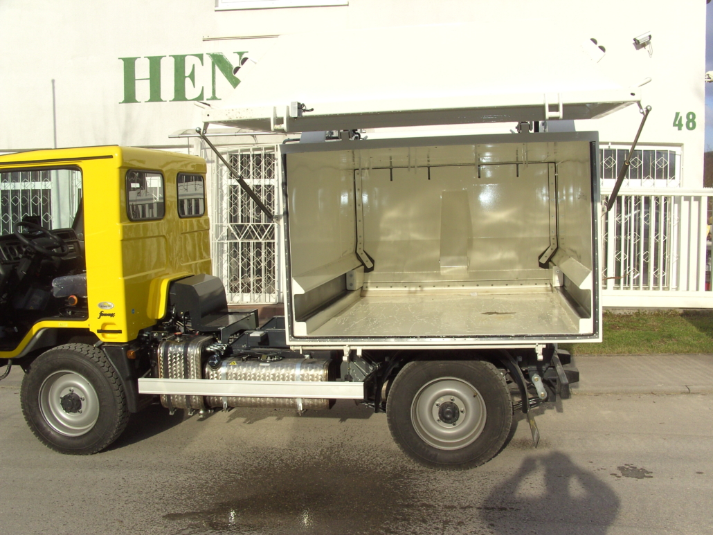 Includes a hydraulic lift-tilt device instead of a loading door.