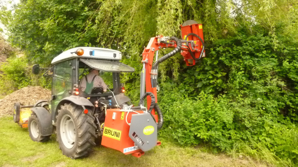 Bruni Auslegemähgeräte mit Zweiarm-Konstruktion und 195° drehbarem Mulchkopf: NTP 370/470 zum Anbau an kleinere Traktoren.
