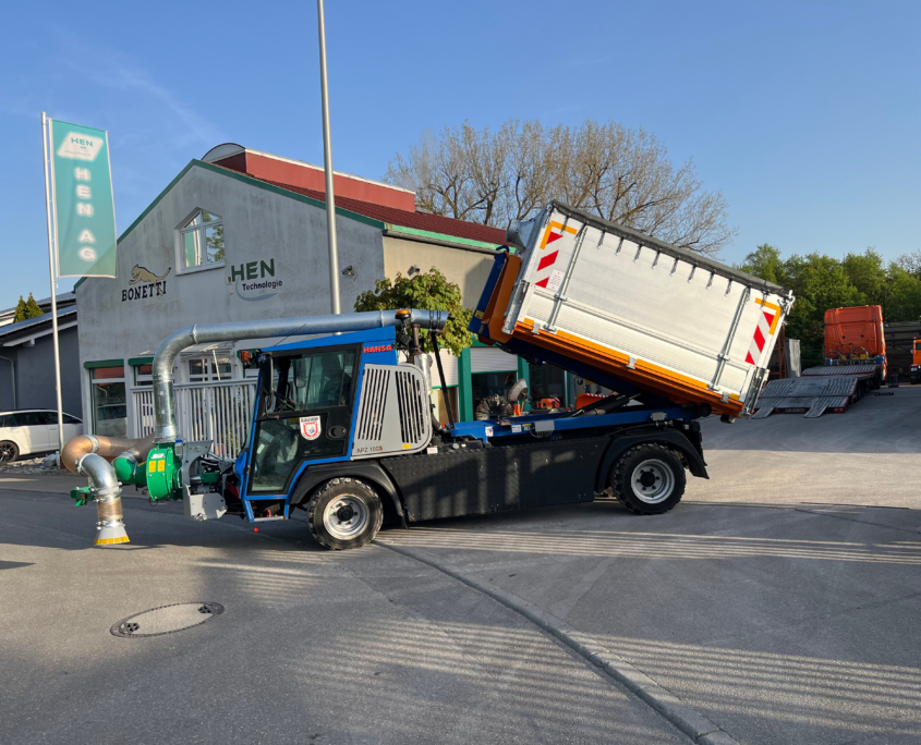Produkte: HEN Laubsaugwagen EDK 60 mit angebautem HEN-Hochleistungs-Zapfwellensaugüberladegebläse T 600, inklusive Auslegerarm